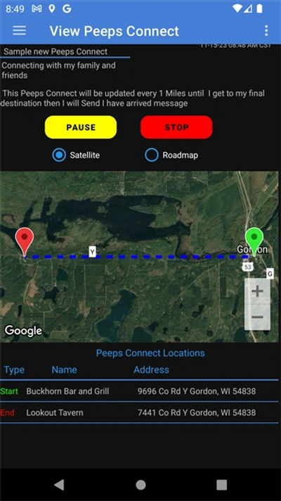 The pause and start capabilities are useful in recurring Peeps Connects where the user is traveling and stopping for a period of time (i.e. an overnight stay or stopping for lunch). Current location information will be captured at the point of the pause and start.