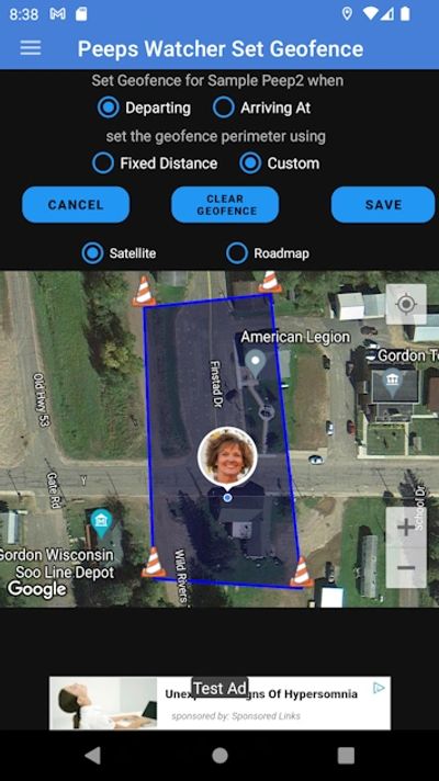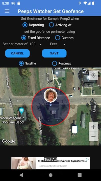 After a geofence is set and saved, the Peeps Watcher Map will be re-displayed to include current locations, destinations and geofence.